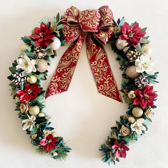 商品名:クリスマスリース2025 レッド&ホワイト(ベル付) クリスマスリース2025 レッド&ホワイト(ベル付)は、シックな赤と清楚な白のポインセチアが華やかに飾られ、ゴールドのオーナメントボールで引き立てられた特別なデコレーションアイテムです。 サイズは縦約55cm×横約45cmで、玄関やリビング、お部屋のスタイリッシュなアクセントとして飾るのに最適です。 ベルのないタイプもございます。 このリースは、15種類以上の高級リボンを使用しており、ポインセチアの他にバラやパインコーンもすべてリボンで作られています。 中央には豪華な大きな赤いリボンが施され、温かみと優雅さが調和した印象を与えます。 クリスマスカラーの赤と白、豊かな緑にゴールドが融合し、一目で魅了する華やかな雰囲気を醸し出します! また、中央には可愛いゴールドのベルを付けており、より一層特別な魅力を加えています。 専用の箱に入れてお送りしますので、大切な方への贈り物にもピッタリです。 ベルのないタイプもございます。 ぜひ、この機会に他のクリスマスアイテムもご覧ください!