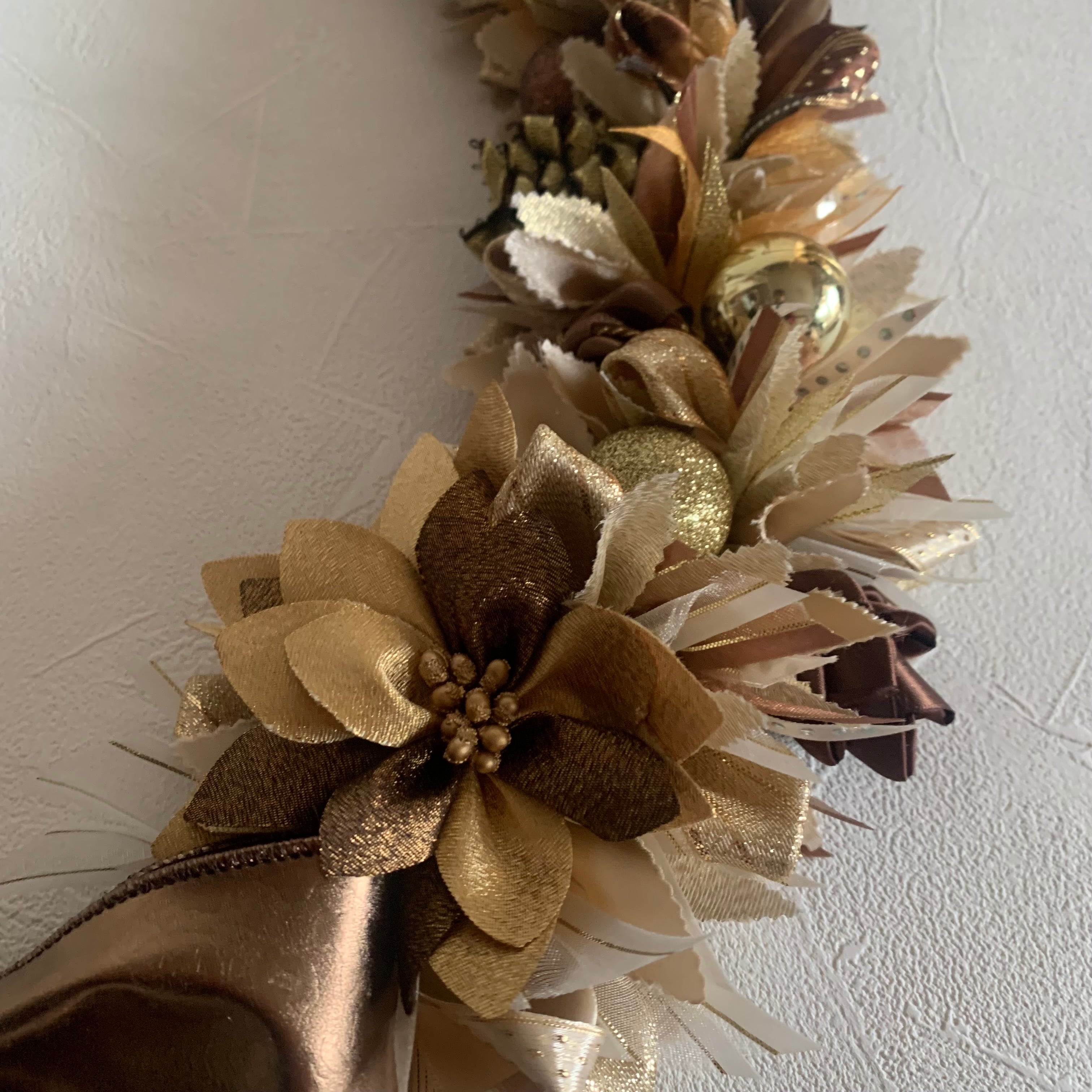クリスマスリース2025 ブラウン&ゴールドは、深みのあるブラウンと華やかなゴールドが絶妙に調和した、特別なクリスマスを演出するデコレーションアイテムです。