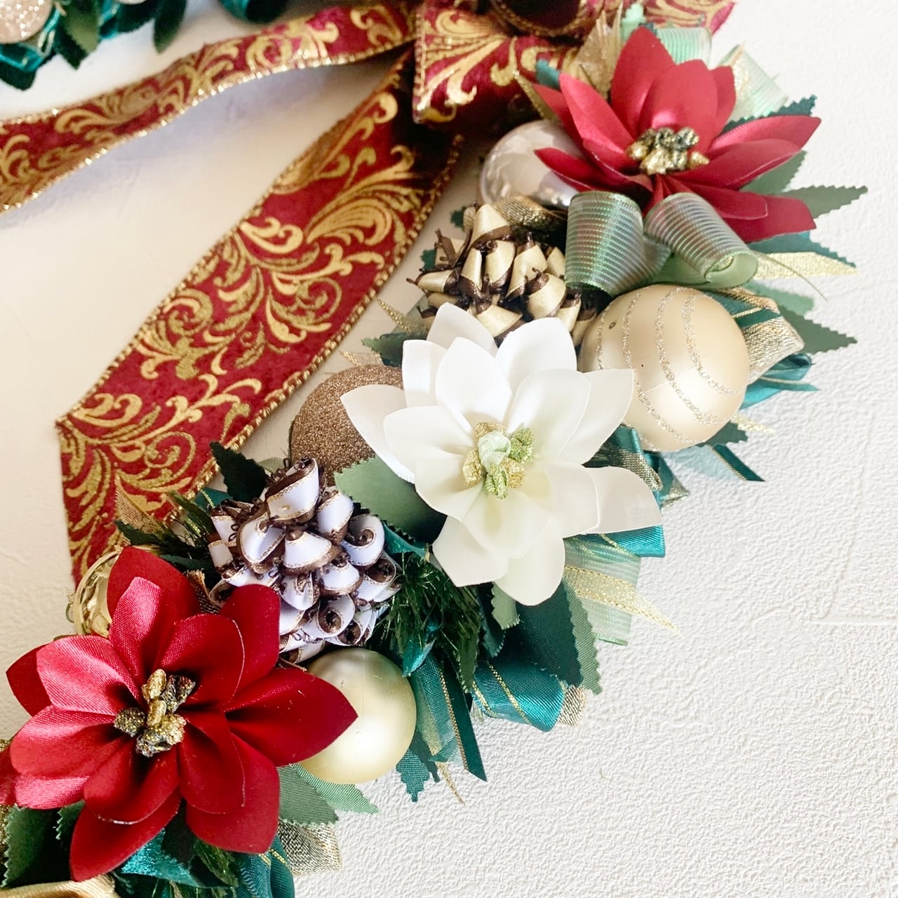 クリスマスリース2025 レッド&ホワイトは、グリーンにシックな赤と白のポインセチアをちりばめ、ゴールドのオーナメントボールでアクセントリボンリースです。