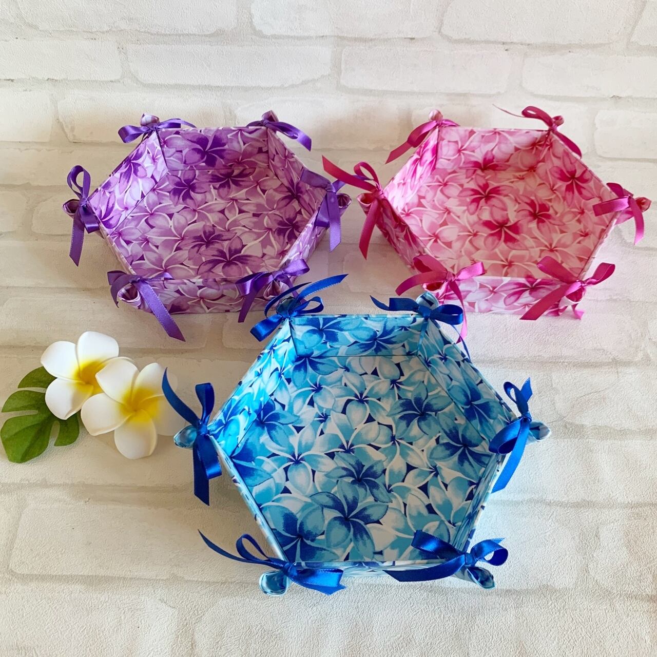 ハワイから届いたキュートなプルメリアプリントで作ったアトリエティーローズオリジナルデザインの六角形リボントレーです。
